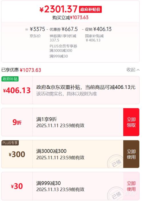 商品到手价2281.37元(需领券),根据小编提供的优惠信息(满999减30+满1元,打9折+京东 plus 双11 1111元超级补贴 (500-50/1111-111/1500-150/3000-300/5000-500元)+9.9元买家居卡499-40),下单1件。好价不错过,感兴趣的朋友可以试试!