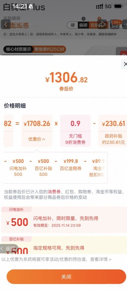 商品到手价1306.82元+8994淘金币,根据小编提供的优惠信息(优惠券+88vip双11无门槛9折 开门红消费券 至高抵(50/200/500)+家装家纺-政府补贴15%/20%--部分地区可领+百亿补贴金刚券-9折/8折),下单1件。好价不错过,感兴趣的朋友可以试试!
