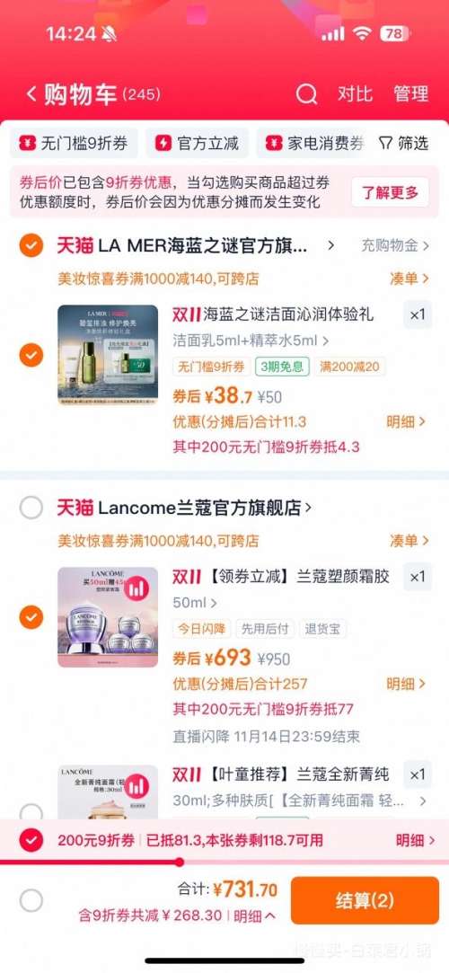 商品到手价693元包邮(需领券、需凑单),根据小编提供的优惠信息(优惠券+88vip双11无门槛9折 开门红消费券 至高抵(50/200/500)+满1000-140美妆券+凑单品(可退)+慢津贴5.03元),下单1件。好价不错过,感兴趣的朋友可以试试!