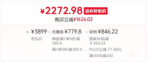 商品到手价2172.98元(需领券),根据小编提供的优惠信息(满1元,打9折+满1元,打9折+家电-政府补贴15%/20%-部分地区可领+慢津贴10.86元),下单1件。好价不错过,感兴趣的朋友可以试试!