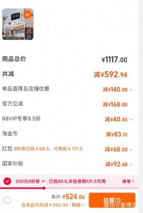 商品到手价524.06元(需领券),根据小编提供的优惠信息(优惠券+满1000减100+88vip双11无门槛9折 开门红消费券 至高抵(50/200/500)+家装家纺-政府补贴15%/20%--部分地区可领+如何使用淘金币抵扣),下单1件。好价不错过,感兴趣的朋友可以试试!