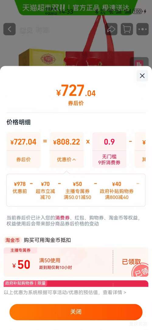 商品到手价727.4元+978淘金币(需领券),根据小编提供的优惠信息(优惠券+满800减40商品页+88vip双11无门槛9折 开门红消费券 至高抵(50/200/500)),下单1件。好价不错过,感兴趣的朋友可以试试!