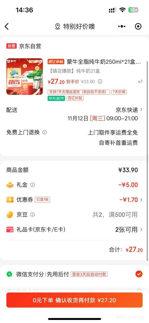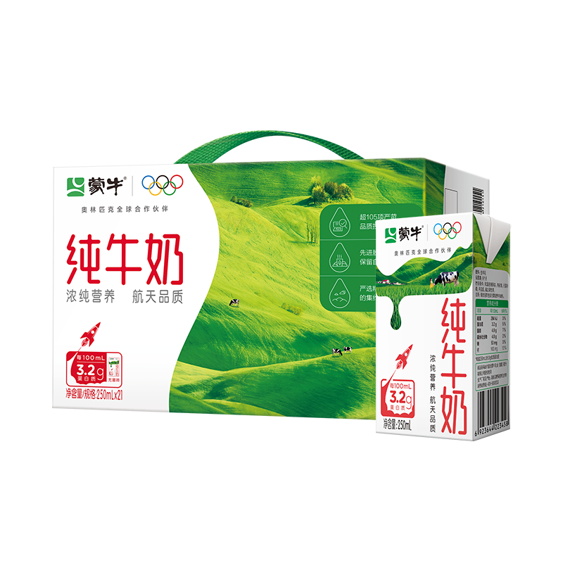 京东自营微信小程序:蒙牛 全脂 利乐砖 纯牛奶 3.2g蛋白质 250ml 21盒