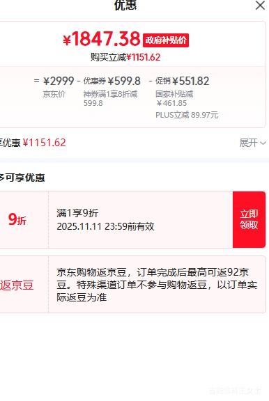 商品到手价1847.38元(需领券),根据小编提供的优惠信息(满1元,打8折+家电-政府补贴15%/20%-部分地区可领),下单1件。好价不错过,感兴趣的朋友可以试试!