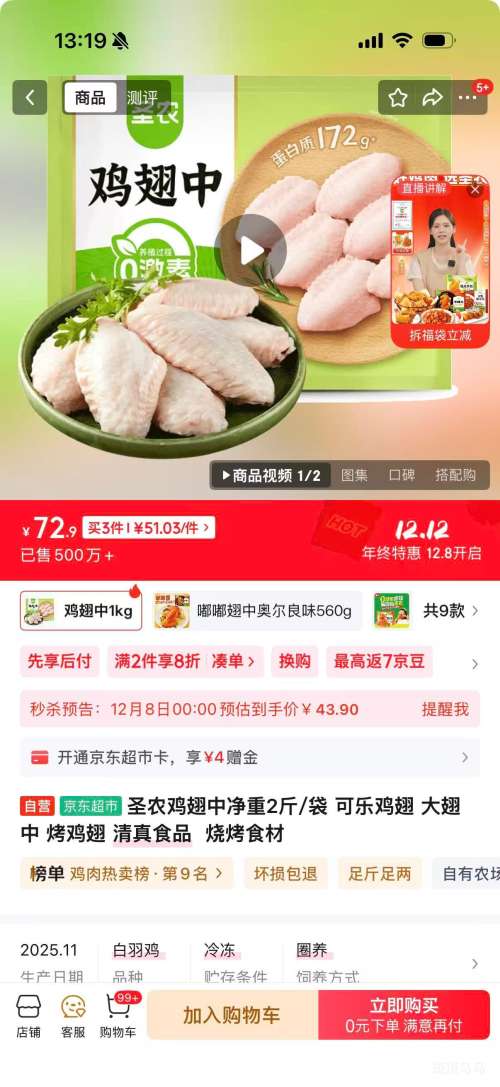 京东自营8日:圣农 鸡翅中净重2斤/袋