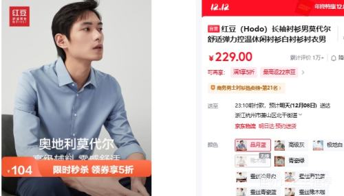 京东自营 7日 20点: 红豆 Hodo 长袖衬衫男莫代尔舒适弹力控温休闲衬衫