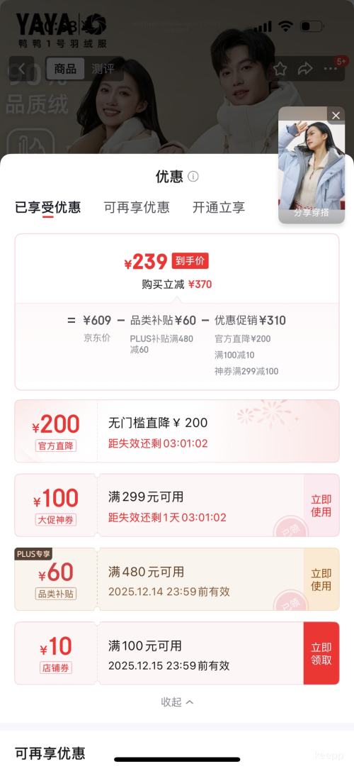 商品到手价239元包邮,根据小编提供的优惠信息(满299-100元+plus 限时加码好券160-20/5000-500/2000-200/480-60),下单1件。好价不错过,感兴趣的朋友可以试试!
