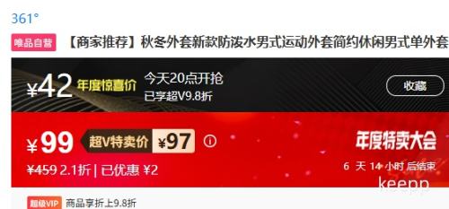 唯品会20点、超V会员:361° 秋冬外套新款防泼水男式运动外套