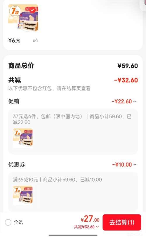 商品到手价27元(需领券,合6.75元/件),根据小编提供的优惠信息(35减10),下单4件。好价不错过,感兴趣的朋友可以试试!