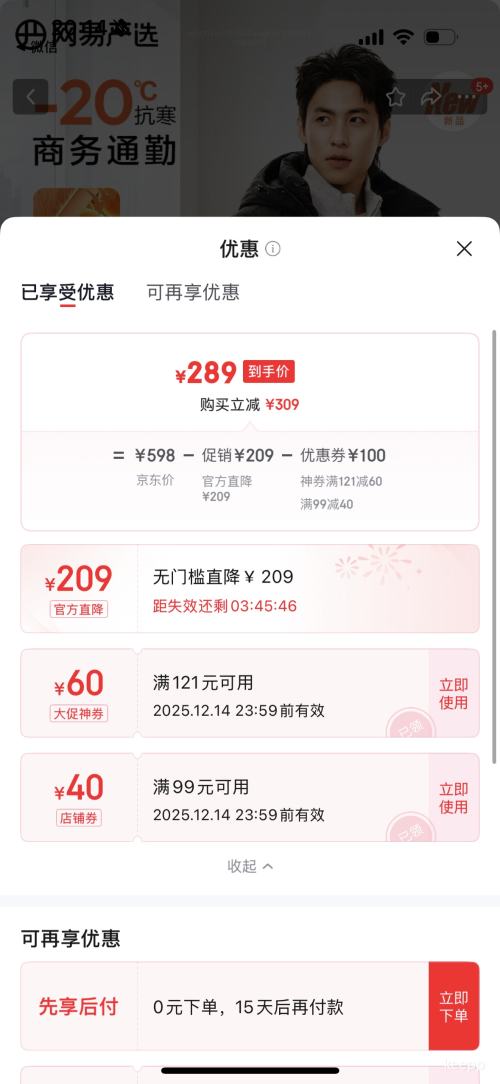 商品到手价289元包邮,根据小编提供的优惠信息(满99-40元+满121-60元),下单1件。好价不错过,感兴趣的朋友可以试试!