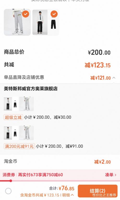商品到手价77元(需领券,合38.50元/件),根据小编提供的优惠信息(优惠券+满200减91+如何使用淘金币抵扣+慢津贴1元+88vip 双12 88折/9折 780元消费券 至高抵(20/60/200/500)),下单2件。好价不错过,感兴趣的朋友可以试试!