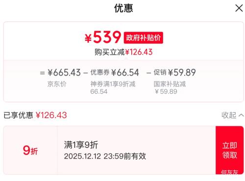 商品到手价539元(需领券),根据小编提供的优惠信息(满1元,打9折+家电-政府补贴15%/20%-部分地区可领),下单1件。好价不错过,感兴趣的朋友可以试试!