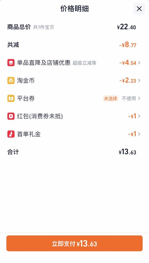 商品到手价13.63元+2.23元淘金币,根据小编提供的优惠信息(优惠券+如何使用淘金币抵扣),下单1件。好价不错过,感兴趣的朋友可以试试!