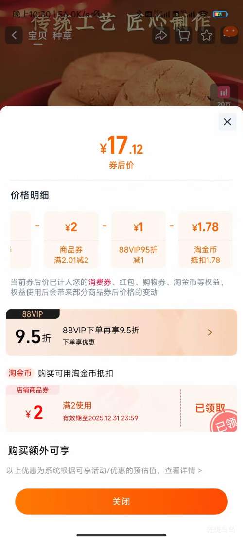 商品到手价17.12元(88vip全能卡15.12元),根据小编提供的优惠信息(优惠券+满2.01减2+如何使用淘金币抵扣 1.78),下单1件。好价不错过,感兴趣的朋友可以试试!