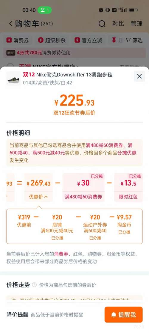 商品到手价239.43元+9.57元淘金币,根据小编提供的优惠信息(优惠券+88vip 双12 88折/9折 780元消费券 至高抵(20/60/200/500)+如何使用淘金币抵扣),下单1件。好价不错过,感兴趣的朋友可以试试!