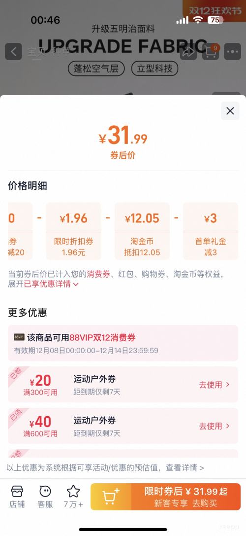 商品到手价33.95元包邮+12.05元淘金币(需领券),根据小编提供的优惠信息(优惠券+满129减20+如何使用淘金币抵扣),下单1件。好价不错过,感兴趣的朋友可以试试!