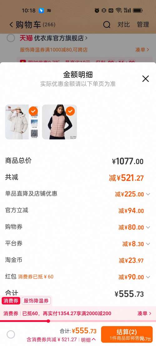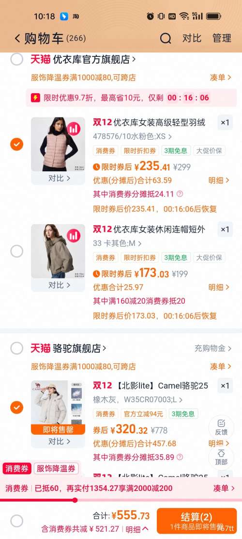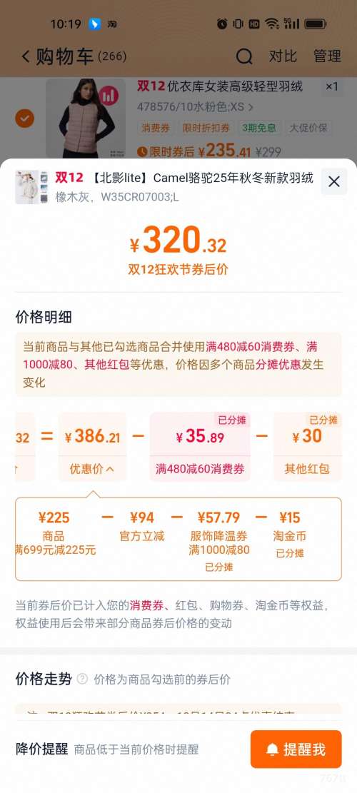 商品到手价320.32元+15元淘金币(需领券、需凑单),根据小编提供的优惠信息(优惠券+满699减225+降温服饰券 满1000减80+88vip 双12 88折/9折 780元消费券 至高抵(20/60/200/500)+如何使用淘金币+凑单品(可退)+慢津贴4.74元),下单1件。好价不错过,感兴趣的朋友可以试试!