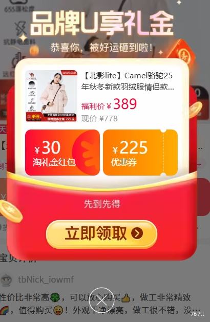 天猫旗舰店天降礼金、88VIP:Camel骆驼 25年秋冬新款 羽绒服 情侣款 保暖厚款大围领