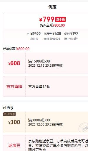 商品到手价799元(历史最低价!双12),根据小编提供的优惠信息(满1599减608+慢津贴4.39元),下单1件。好价不错过,感兴趣的朋友可以试试!