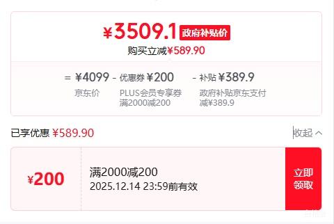 商品到手价3449.1元(非国补,晒单返60元京豆后),根据小编提供的优惠信息(满2000减180+plus 双十二限时加码好券160-20/5000-500/2000-200/480-60+手机国补-国家/政府补贴5%/10%/15%(至高500,默认为政补 解绑政补后可切换为国补)),下单1件。好价不错过,感兴趣的朋友可以试试!