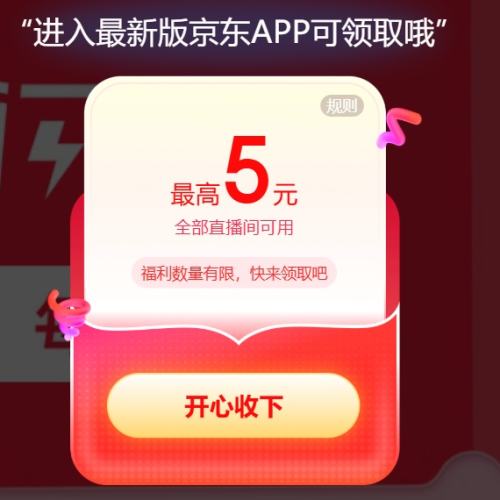 京东自营羊毛福利:京东 直播闪购 可领最高5元随机红包(全部直播间可用)