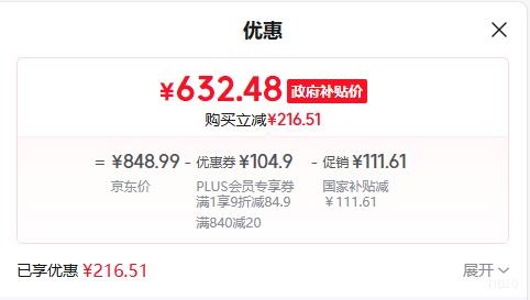 商品到手价632.48元(需领券),根据小编提供的优惠信息(满840减20+plus 双十二限时加码好券160-20/5000-500/2000-200/480-60+ 双12主会场 惊喜红包 200-20*6张+家装厨卫适老化-国补至高30%),下单1件。好价不错过,感兴趣的朋友可以试试!