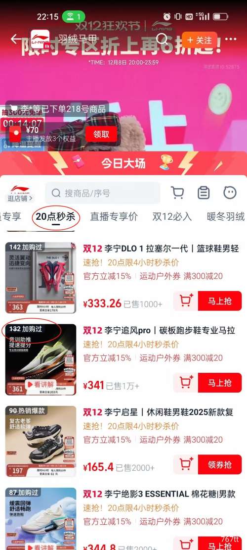 天猫旗舰店20点直播间抢购:李宁追风pro 碳板 跑步鞋 竞速运动鞋男