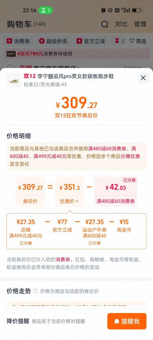 商品到手价309.27元(需领券),根据小编提供的优惠信息(优惠券+满499减40+运动户外券 满600减40+88vip 双12 88折/9折 780元消费券 至高抵(20/60/200/500)+凑单品),下单1件。好价不错过,感兴趣的朋友可以试试!