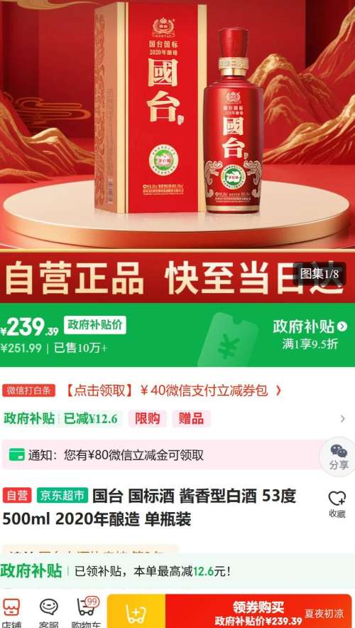 京东自营国台 国标酒 53° 酱香型 500ml 1瓶