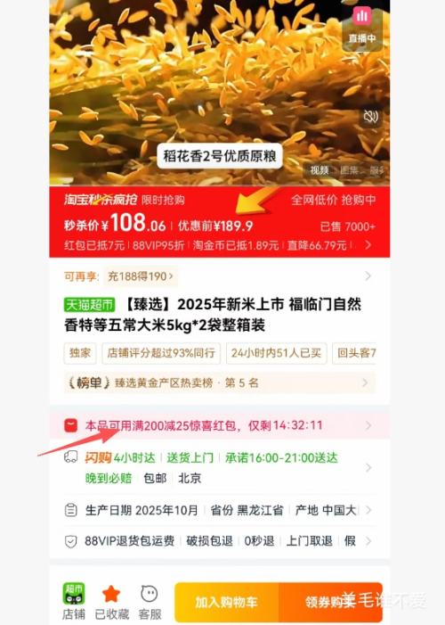 天猫超市闭眼买:福临门 自然香特等五常大米 10斤*2袋 整箱装 2025年新米