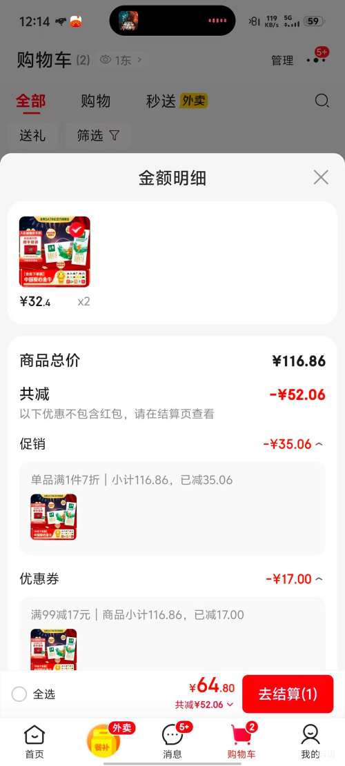 商品到手价64.8元(合32.40元/件),根据小编提供的优惠信息(满99减17),下单2件。好价不错过,感兴趣的朋友可以试试!