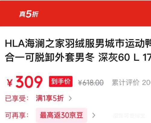 商品到手价309元(需领券),根据小编提供的优惠信息(服饰5折),下单1件。好价不错过,感兴趣的朋友可以试试!