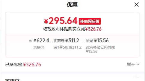 商品到手价295.64元(需领券),根据小编提供的优惠信息(满159减60+1件5折),下单1件。好价不错过,感兴趣的朋友可以试试!