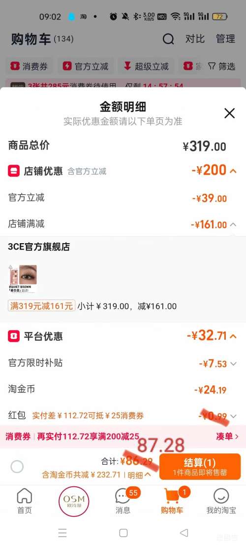 商品到手价87.28元+24.19淘金币,根据小编提供的优惠信息(优惠券+满319减161+淘金币抵扣24.19),下单1件。好价不错过,感兴趣的朋友可以试试!