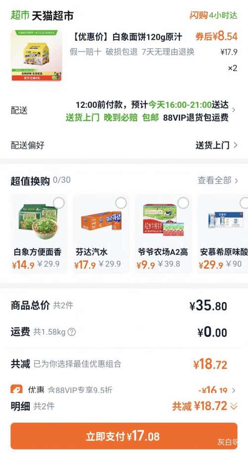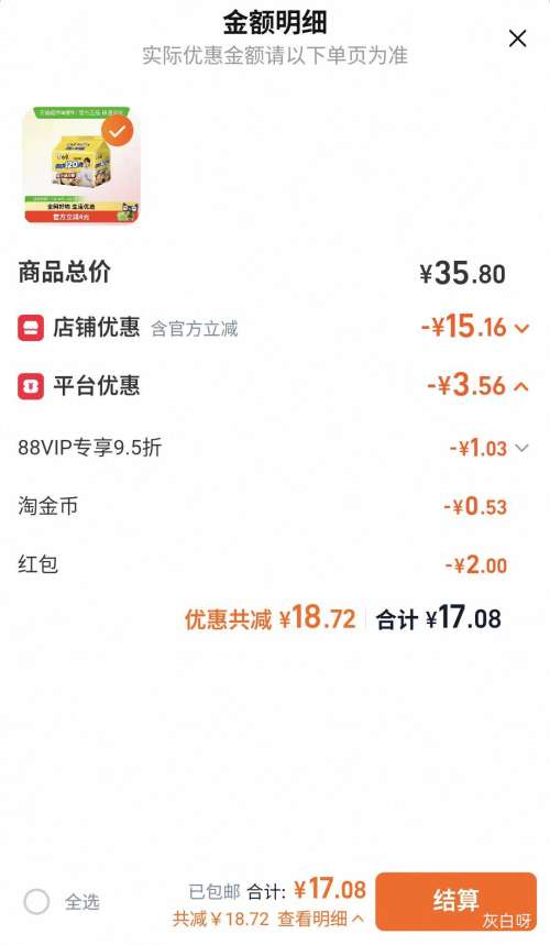商品到手价17.08元(需领券,合8.54元/件),根据小编提供的优惠信息(优惠券+如何使用淘金币抵扣 0.53元),下单2件。好价不错过,感兴趣的朋友可以试试!