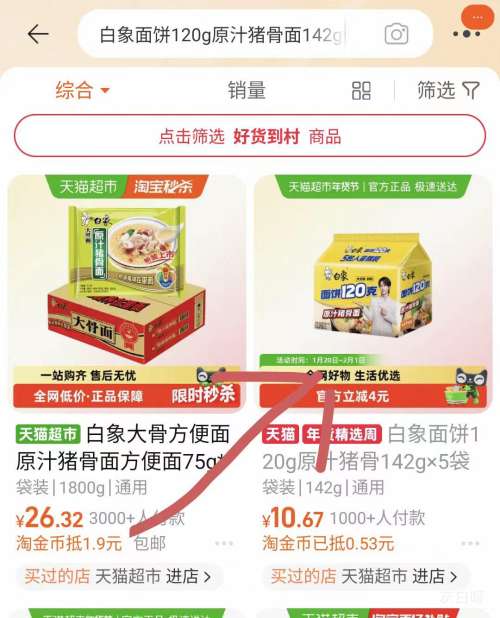 天猫超市88VIP:白象 原汁猪骨面 142g*5袋 *1件 拍两件