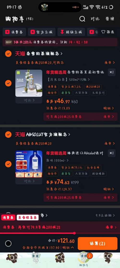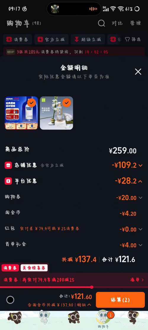 商品到手价74.63元(需领券、需首购),根据小编提供的优惠信息(优惠券+满189减18+美食券凑单品+满250减20+88vip 年货精选周(200-25/480-60/2000-200)+如何使用淘金币抵扣3元),下单1件。好价不错过,感兴趣的朋友可以试试!